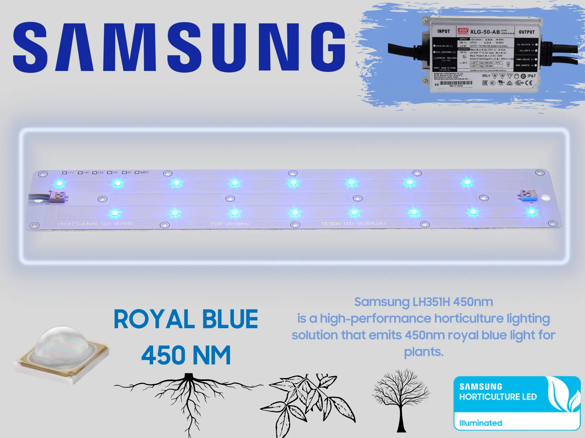 Мощный Королевский синий от Samsung с волной 450NM сделает вашу вегетативную стадию идеальной, при использовании данного усилителя, увеличивается размер ствола, размер кроны, количество ответлений, стимулирует развитие здоровой корневой системы, что в свою очередь создаёт сильный фундамент для мощной и интенсивной стадии цветения.